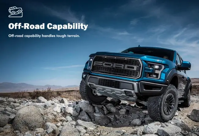 Off-road tires, lift kits, and skid plates enhance truck capabilities.